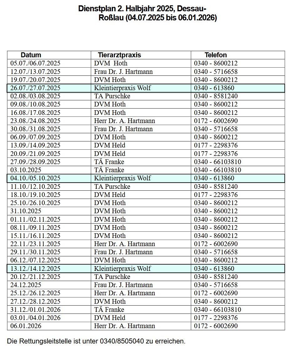 Im Notdienstplan finden Sie die zuständige Tierarztpraxis für Wochenenden und Feiertage. Die diensthabende Praxis unter der Woche erfragen Sie bitte über die Leitstelle unter der Telefonnummer 0340/8505040.