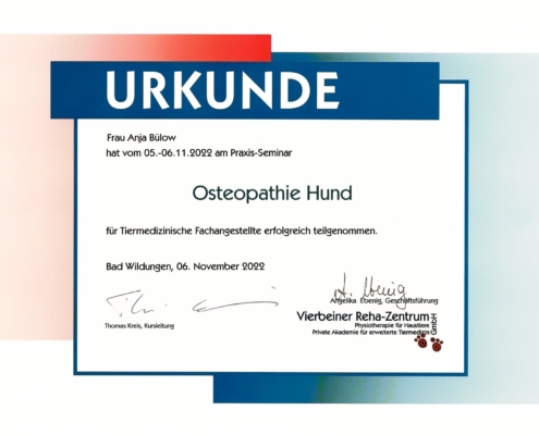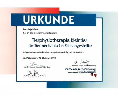 Unsere Tierphysiotherapeutin Anja Bülow hat ihre 2-jährige Ausbildung im renommierten Vierbeiner Reha-Zentrum in Bad Wildungen absolviert.